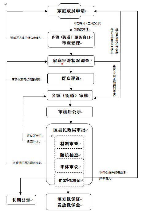 提出申請---審查受理---調查核實---群眾評議---鎮(街道)審核---區民政局審批---發放低保證和低保金