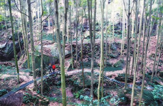 11月11日,大足區(qū)高坪鎮(zhèn)巴蜀雅楠景區(qū)內(nèi),游客沿著蜿蜒的石板小徑漫步于茂密的金絲楠木林間,感受這片百年林海特有的靜謐與清幽。