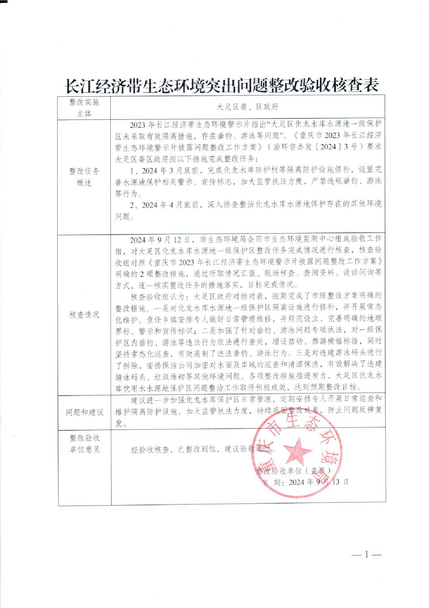 重慶市大足區(qū)長江經(jīng)濟帶生態(tài)環(huán)境突出問題整改驗收核查公示